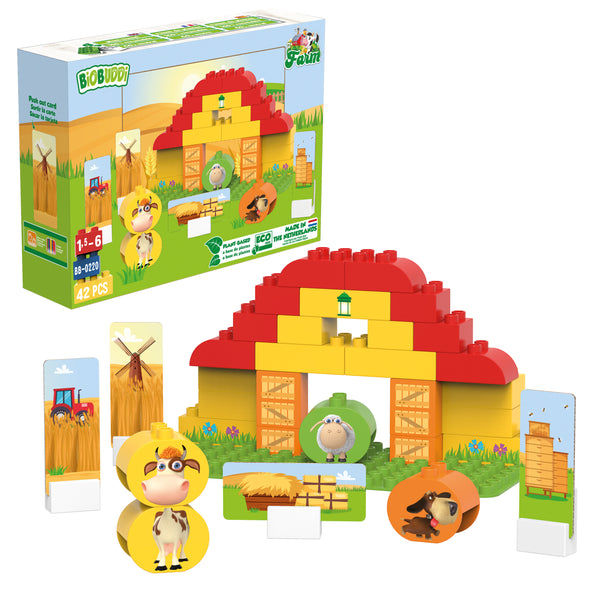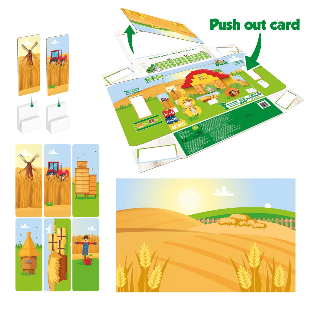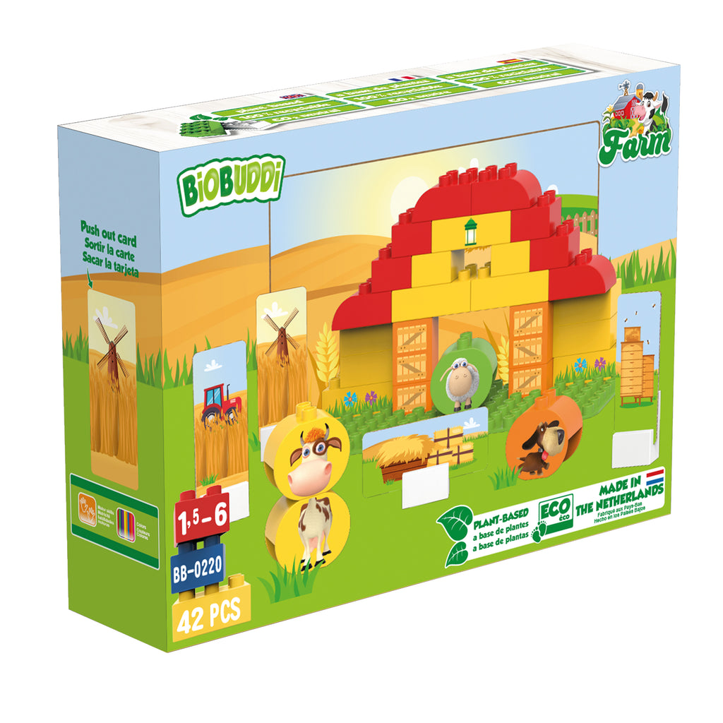 Build your own grain farm with the building blocks and base plate. There are also 6 express cards and 1 background card that you can easily print out of the packaging and put in the 6 supplied slot blocks for even more fun. The packaging is FSC certified and partly because of this also environmentally friendly. You can of course also expand your farm with one of the other BiOBUDDi Farm play sets.