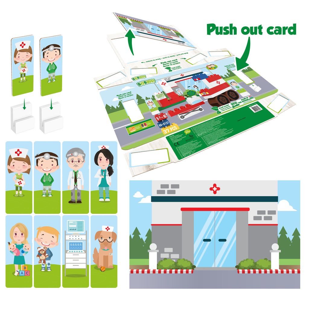 The HOSPITAL play set consists of 37 different parts, made from remains of the sugar cane plant. The blocks are environmentally friendly, recyclable, sustainable and also interchangeable with other brands. The packaging is designed so that it forms part of the product. It is made of FSC cardboard and with a simple "push" you can easily take out different cards and put them in the enclosed card holders for even more playing fun.