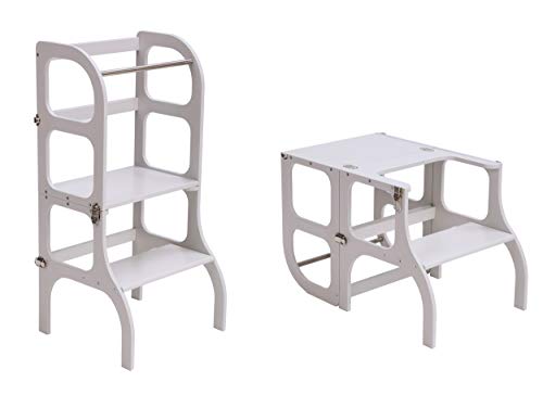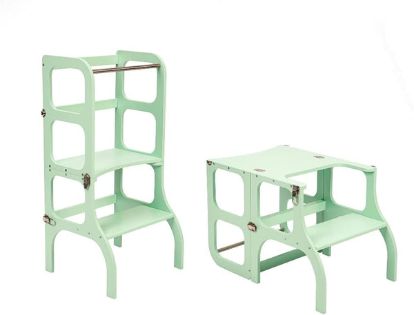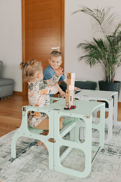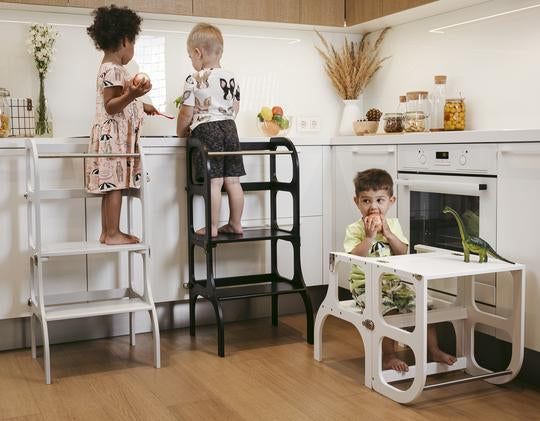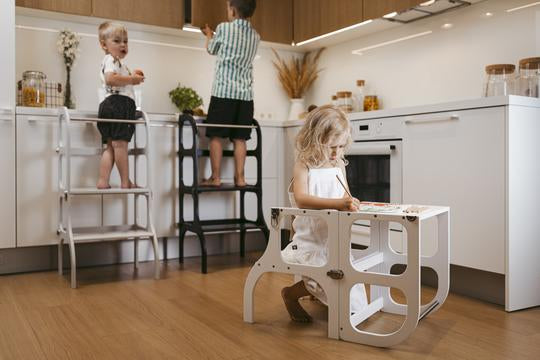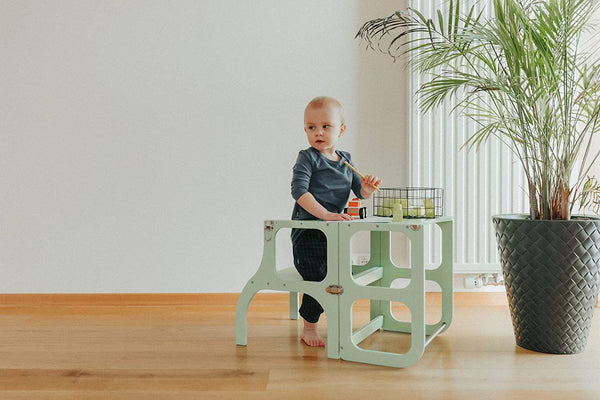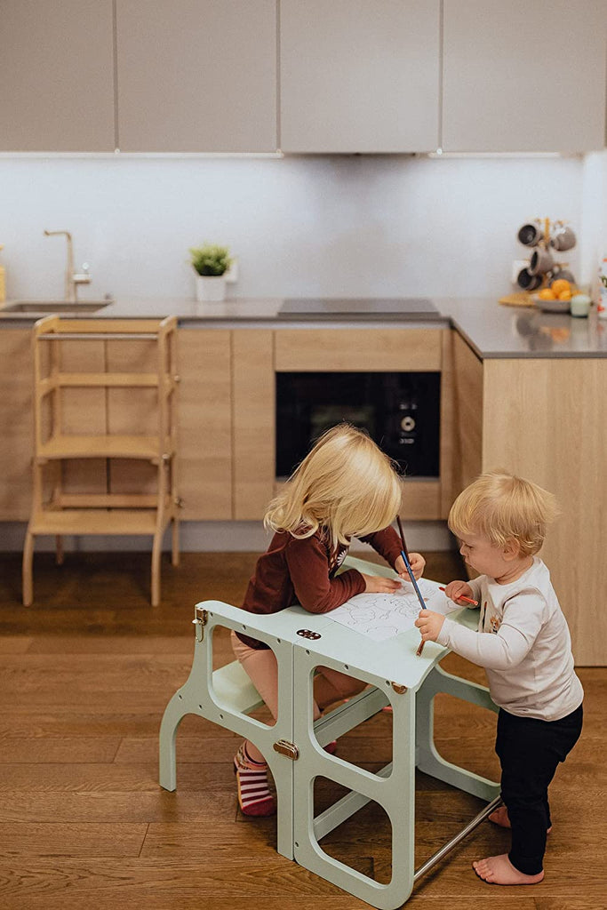 Express your child's curiosity with this transformable Montessori helper tower - table. Allow them to safely help you at the kitchen counter and create wonderful drawings at their own table. Let them discover a new world!
