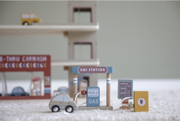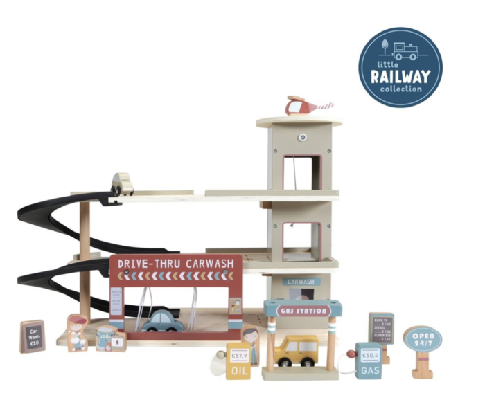 Stop by the garage to fill up on gas, park your car or get it cleaned in the carwash. The wooden garage is one of the many playsets that can be connected to the Little Dutch railway set. The garage includes a helicopter platform and the wooden figurines and elements all have detailed illustrations on both sides. Complete the garage with the railway train XXL set and additional extension sets for hours of fun play.
