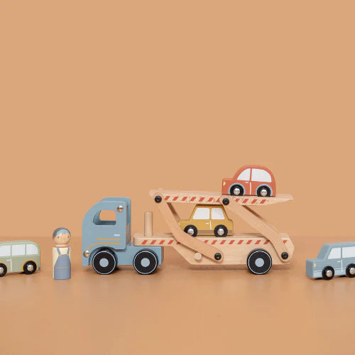 Oh, dear! Car trouble on the road. Luckily, getting the 4 included vehicles to the garage is no problem for this wooden truck. Will you help load the cars onto the truck via the trailer? That way, the truck driver can get to work quickly. A real must-have for your littlest car fanatics!