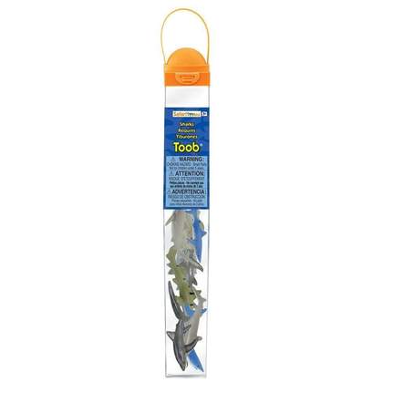- Size and Colour: 1.5 inches long, 1.5 inches wide, and 12.8 inches tall, this Toob is a bit larger than the size of a standard American ruler and contains 11 different shark species, as well as a member of the ray family for a touch of variety, that range from 1.25 to 3.75 inches tall. Be it the long, slender cement coloured fins on the thresher shark or the iconic slate grey coloration on the infamous great white, this Toob captures the essence of the oceans' apex predators.