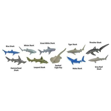- While the aquatic predators in this Toob, including the grey shark, leopard shark, great white, whale shark, thresher shark, spotted eagle ray, blue shark, mako shark, tiger shark, and hammerhead shark may seem fearsome, most sharks are picky eaters and rarely attack humans.