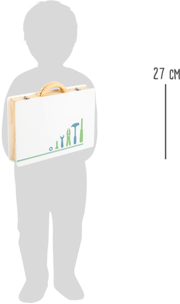 Incl. numerous accessories. Accessories consisting of 5 tools, 1 drill, 3 bits, 11 screws, 11 nuts and 12 perforated strips. The clip fasteners allow everything to be stored safely and with the wooden carrying handles the tool box for boys and girls is ready for the next DIY use.