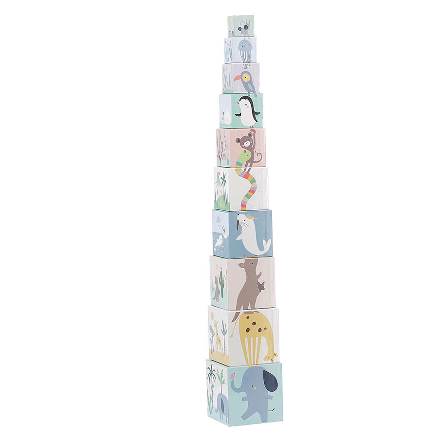 8, 9, 10! Here is the 10th cube placed on the top of this large tower on the Animals of the World theme, gently imagined by illustrator Sarah Betz - Cubeely! Oh ! This is the little gray mouse. Discover our 10 nesting cubes to fit together, stack and drop at will!