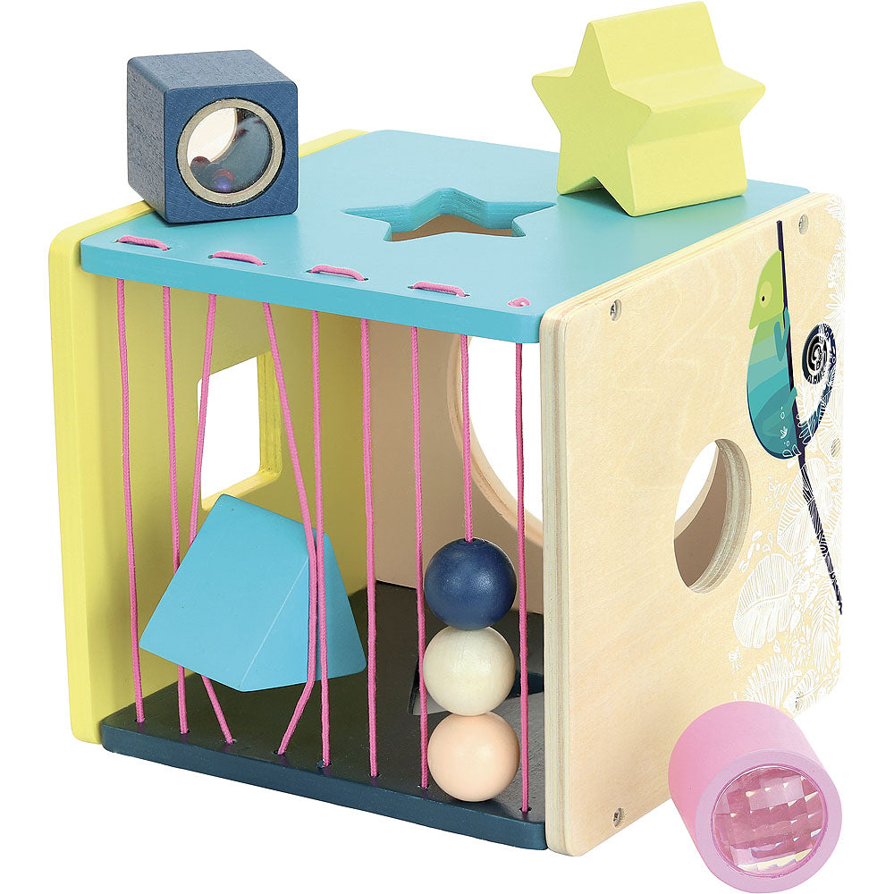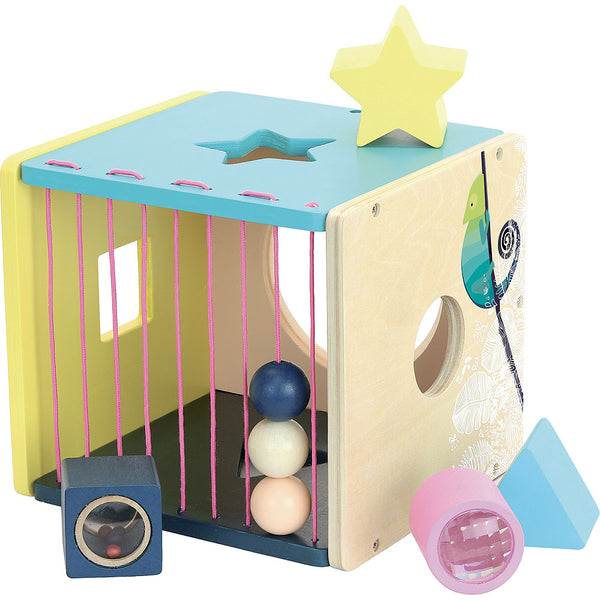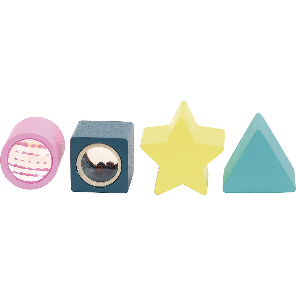 Pretty wooden pieces to play with and slot into a box in natural, striking colours. An early-learning activity for toddlers including 4 fun accessories to entertain toddlers: kaleidoscope cylinder, maracas cube, star and sound-making triangle.