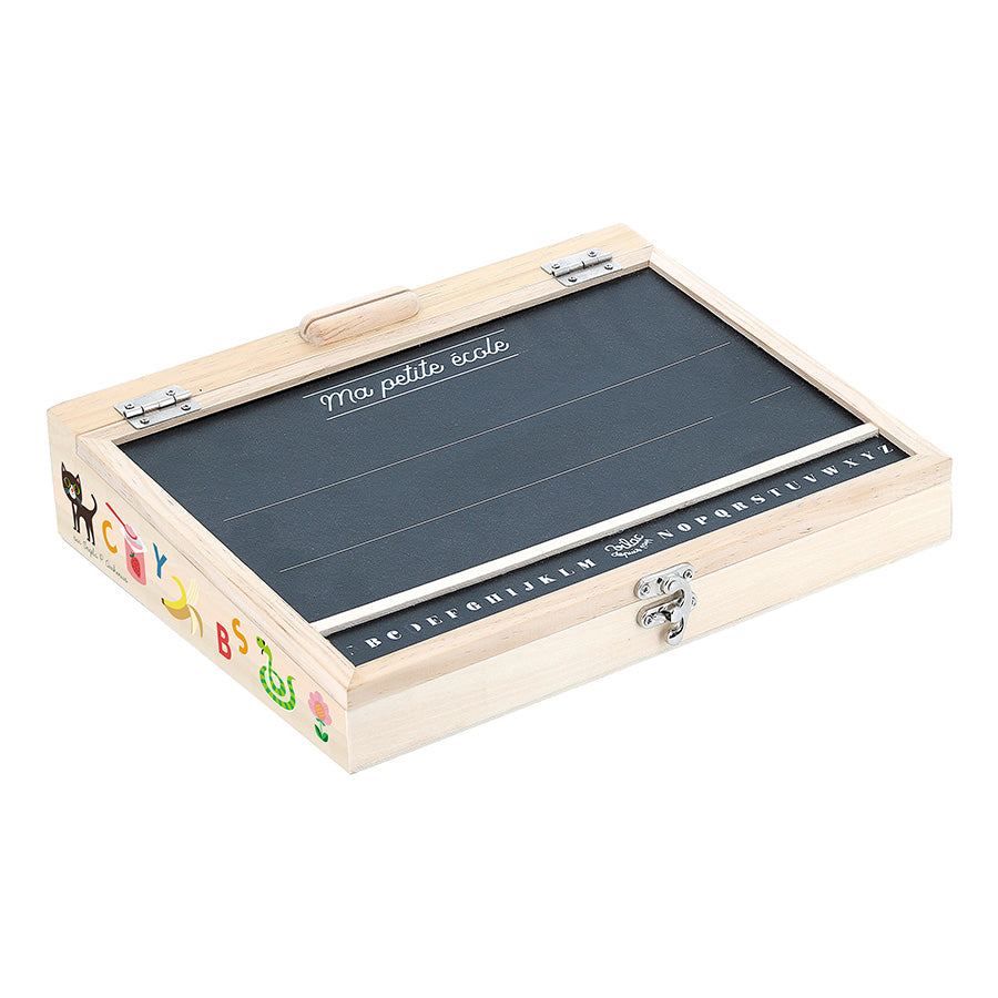 Here is a playful and educational box to learn to read, write and count! This educational game includes 47 wooden letters of alphabet, 23 wooden numbers and 50 vocabulary cards to try to reconstruct words in French and English, but also 30 calculation cards to do your first additions and subtractions. Two chalks come to complete this well-stocked set, as well as 12 good points to reward the well-behaved comforters!
